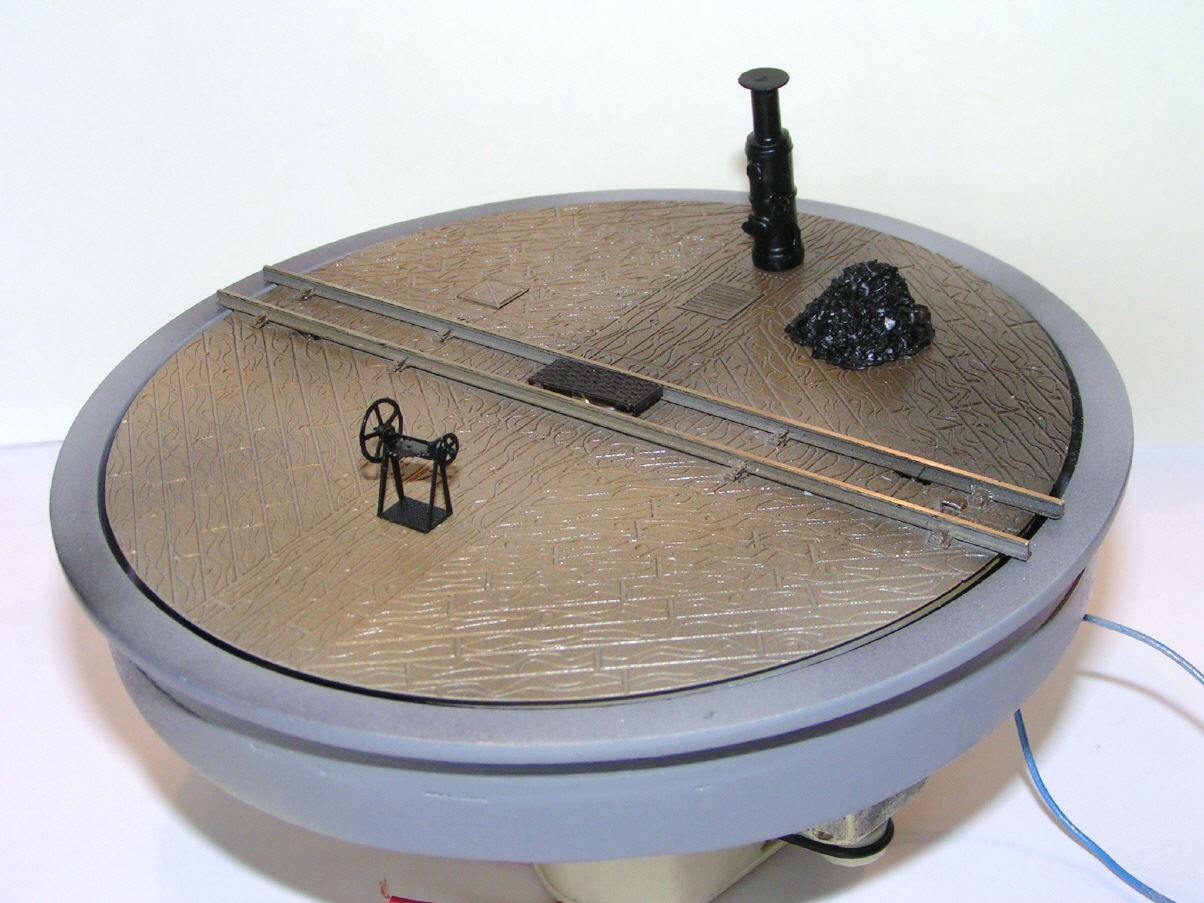 Drehscheibe in vorbildlicher Holzbohlen Abdeckung ( aus feinem Messing) Dampfkessel, Handrad, Kohlehaufen.