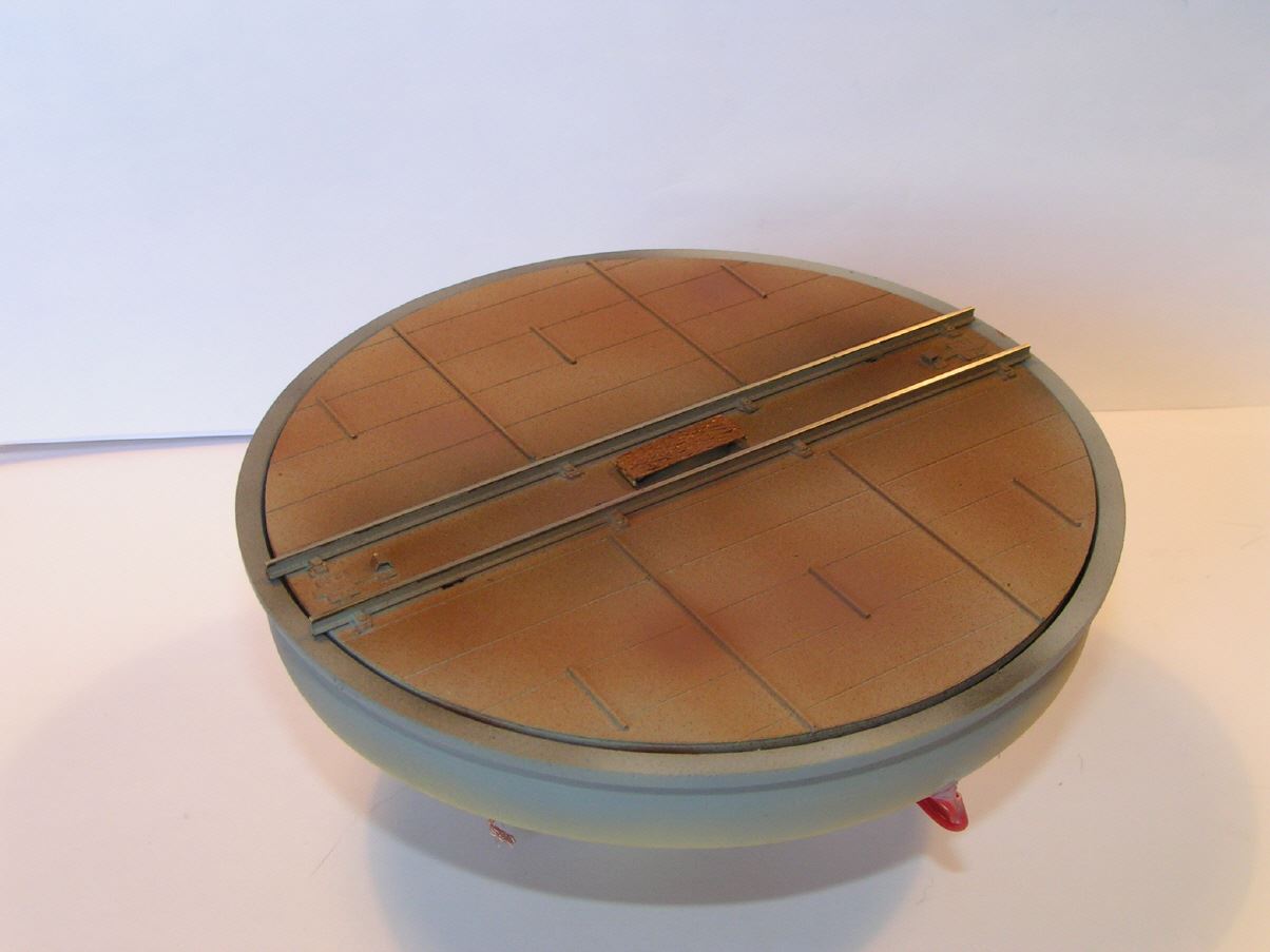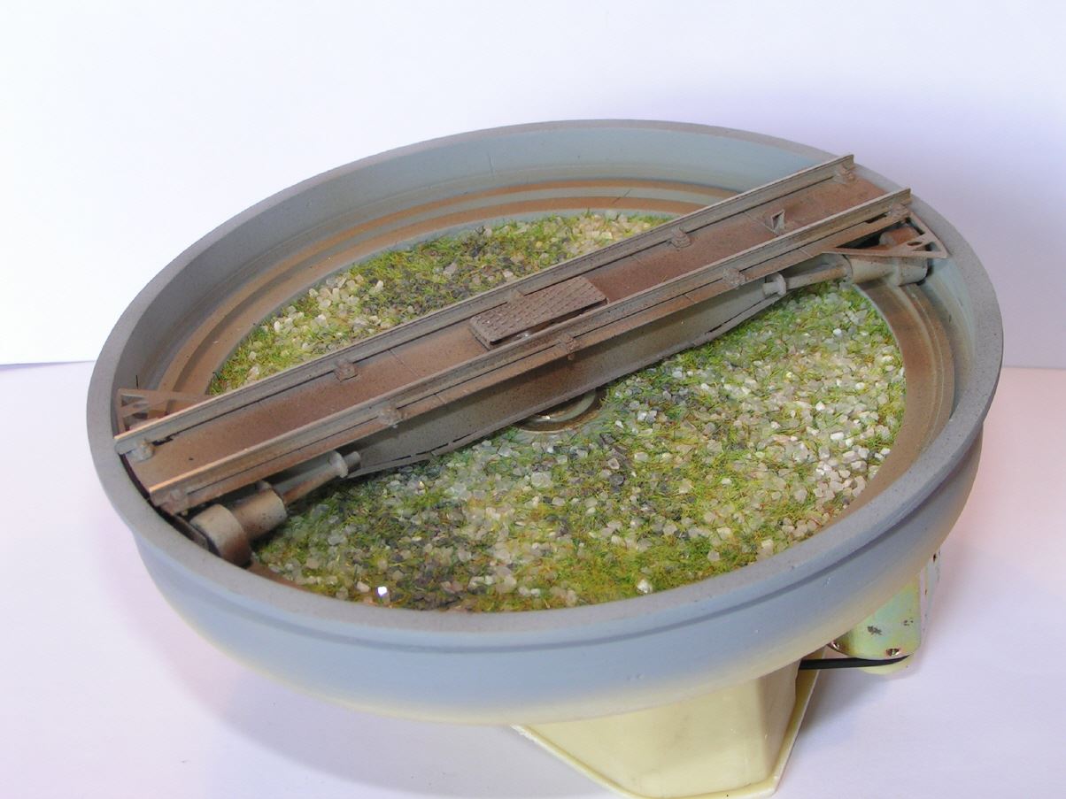 Extra aufgesetzte Kleineisen in der Grube, zum Halten der Schiene * Rand mit Blechimitation verstärkt * Bühne ganz aus feinem Messing* Schiene mit Kleineisen befestigt * Grube mit Schotter und Gras ausgelegt * Die Mittelachse ist mit zwei Kugellagern gelagert.