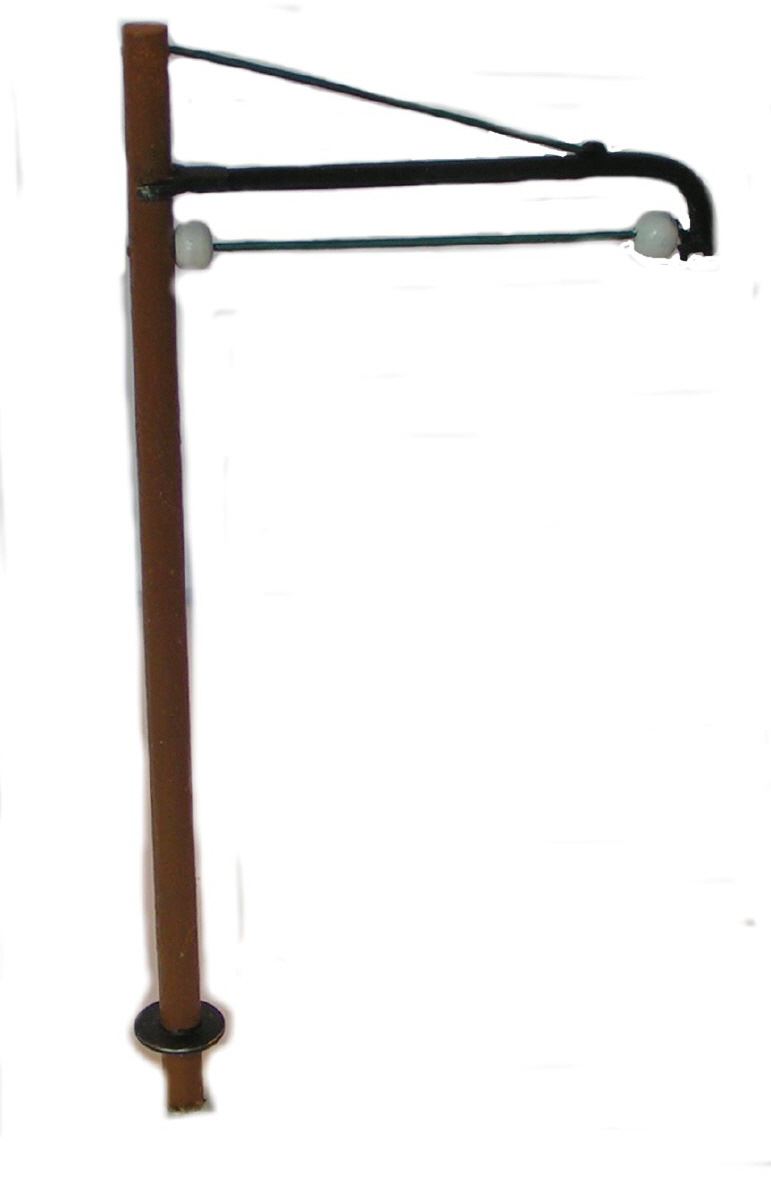 Stecken Oberleitungsmasten. Der Mast ist aus echtem Holz, der Ausleger aus Metall. Als Fahrdrähte empfehlen wir Sommerfeldt Eisendraht verkupfert 0,7 mm Nr. 091